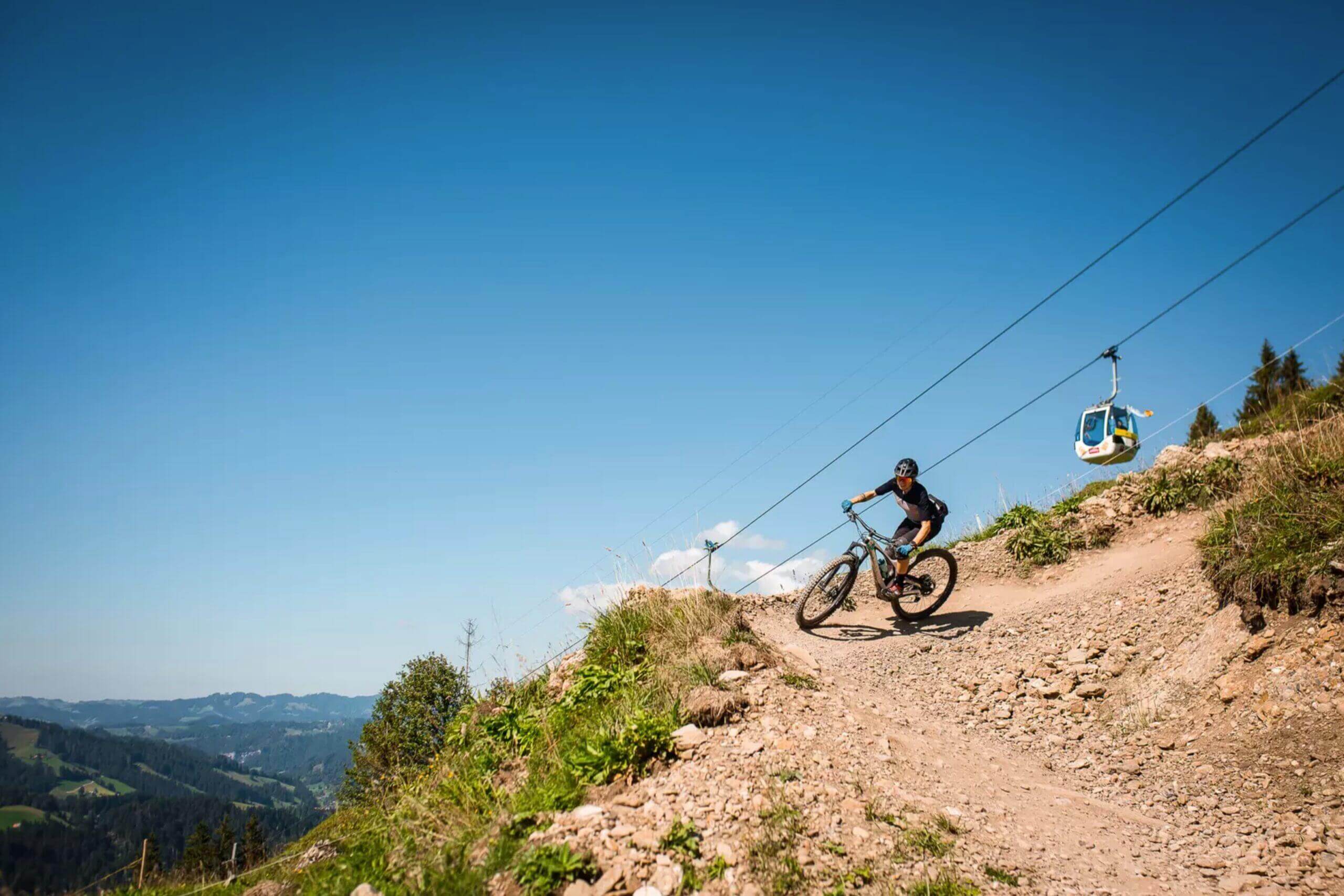 Mit der Gon­del­bahn Mar­ba­chegg kön­nen Bikes trans­por­tiert wer­den. Ko­sten pro Bike: CHF 5.–